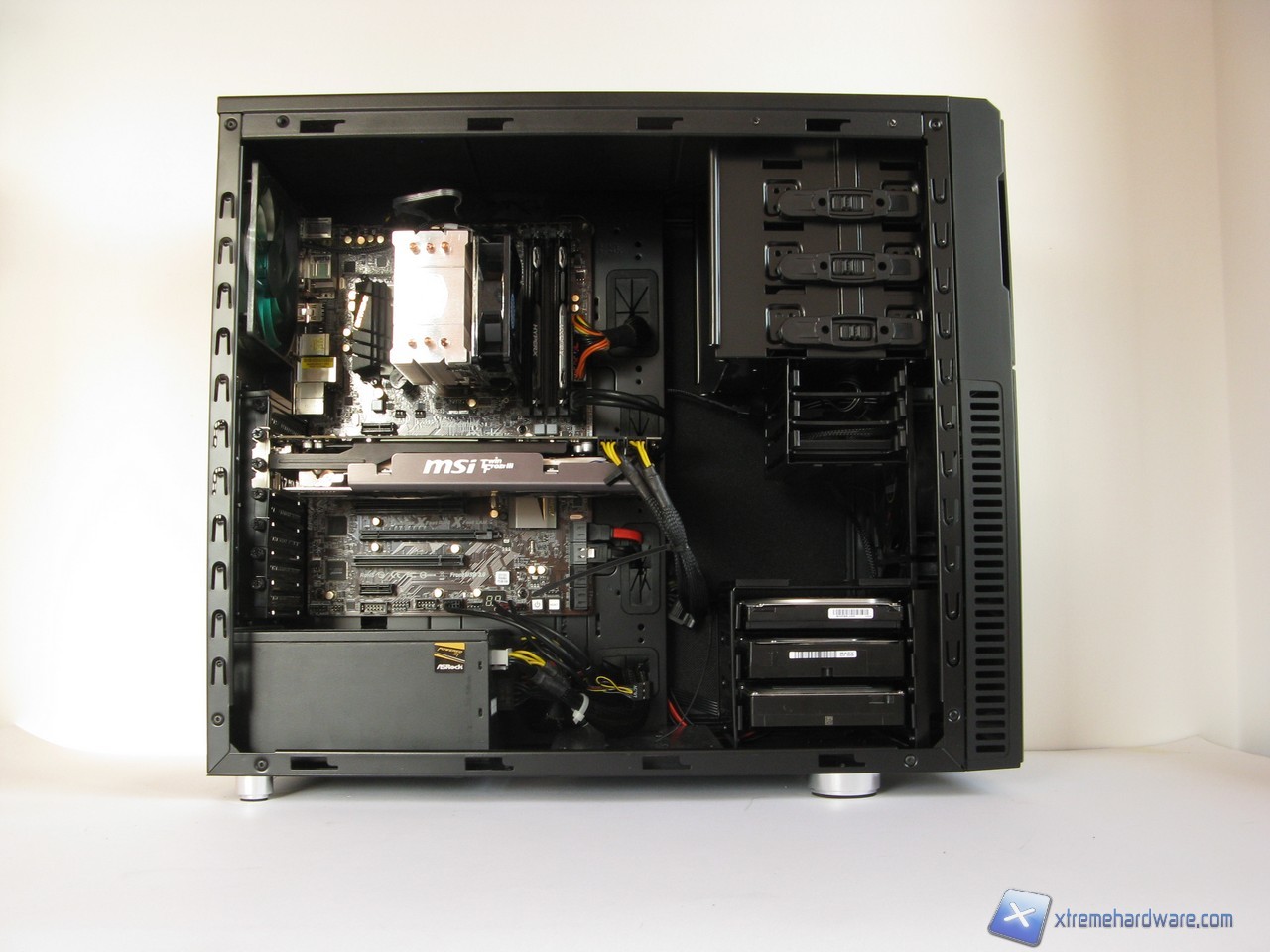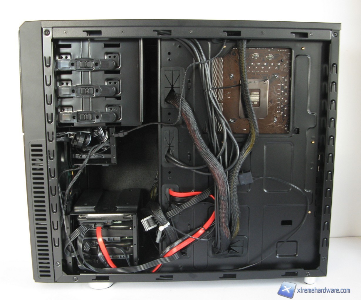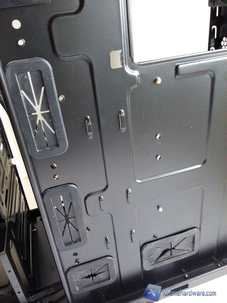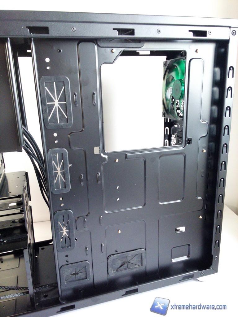 Dedichiamo ora una pagina al capitolo cable management. In questo ambito il Deep Silence 3 non eccelle, ma si colloca comunque nella media di quanto offerto dalla concorrenza; la facilità di organizzazione dei cavi è piuttosto buona, tuttavia i gommini posti sugli appositi fori del vassoio della scheda madre non ci sono sembrati di qualità elevatissima, lo stesso spazio tra la scheda madre e la paratia laterale, che ammonta a poco meno di 2cm, sarebbe anche sufficiente ma non lo può essere pienamente in quanto ricordiamoci che parte di esso viene occupato dal fonoisolante installato sulla paratia laterale.